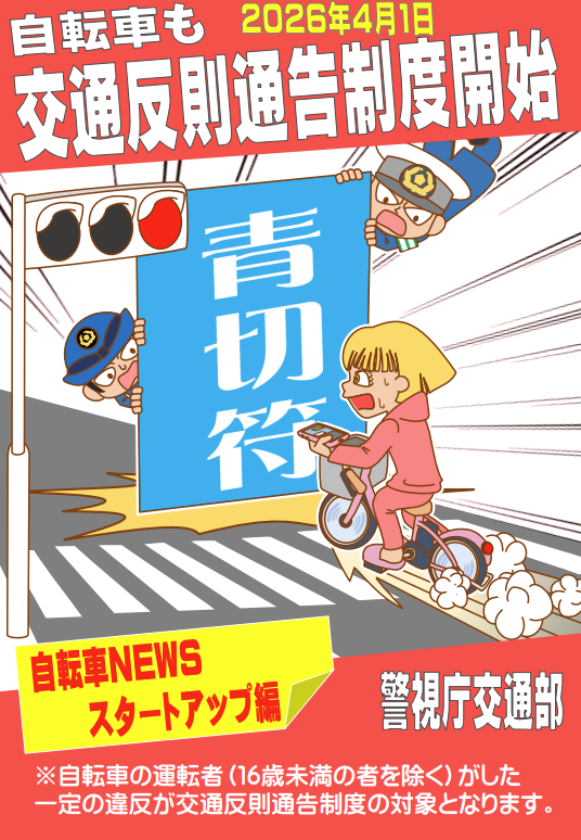 皆様ー!ご存知ですか?令和8年4月1日道路交通法が改正され、自転車の交通違反に「交通反則通告制度」、いわゆる青切符制度が導入されます!これにより、自転車の交通違反に「反則金」が科されるようになります!